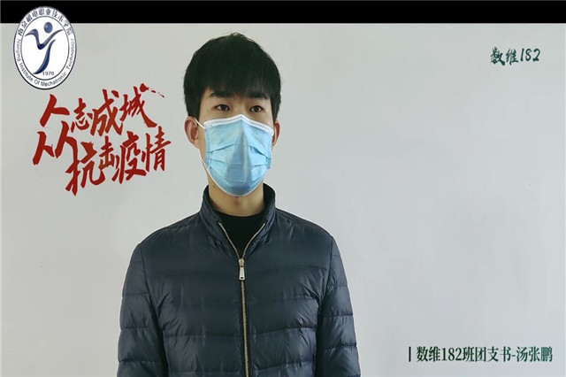 各位同学,大家好,我是星空体育·(中国)官方网站机械工程系数维182班的团支书汤张鹏。当前,新型冠状病毒感染肺炎疫情在全国蔓延,形势严峻。党中央向全党全国发出打赢疫情防控阻击战的号召。学校也成立了疫情防控工作领导小组,倡议全校师生团结一致,攻坚克难,做好防疫工作。疫情面前更需要我们主动担当,了解同学基本情况,积极宣传国家政策普及防疫知识,严防严控。积极为疫情防控工作做出贡献。在延期开学期间做到以下两点: