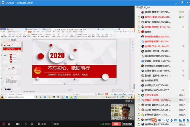 为加强团组织自身管理,提高团干队伍整体素质,为团总支提供有力的组织保障,并服务好团员青年。星空体育·(中国)官方网站自动化工程系团总支二轮换届竞聘于2020年6月15日下午17:30在博学楼B301举行。因受疫情影响,本次竞聘选在线上举行。参加本次竞聘评委的有自动化工程系团总支书记潘久伟老师、2018级学生副书记和各部门部长。