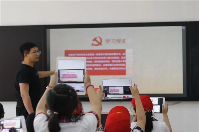 来到教室后,院团委志愿服务部部长罗宏伟为同学们演示了多媒体教室的教学设备,对同学们进行了党史学习教育。教室里传来齐刷刷的朗读声:“学党史,强信念,跟党走”!稚嫩的童声回荡在教室里。