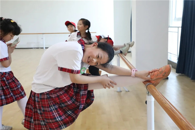 这位女同学一来到舞房就迫不及待的把腿敲上压腿杆尝试了一番,看着她脸上开心的笑容,想必十分喜爱这环境优美的舞房。