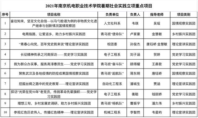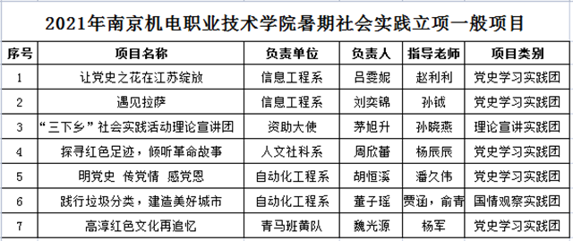 为深入学习宣传贯彻习近平新时代中国特色社会主义思想,贯彻落实习近平总书记关于青年工作的重要思想,引导和帮助广大青年学生上好与现实相结合的“大思政课”,在社会课堂中受教育、长才干、作贡献,在观察实践中学党史、强信念、跟党走,努力成为担当民族复兴大任的时代新人,以实际行动庆祝中国共产党成立100周年,按照团省委《关于开展2021年全省大中专学生志愿者暑期文化科技卫生“三下乡”社会实践活动的通知》相关要求,经自主申报,各团总支、青马班审核推荐,校级专家评审,确定以下10个项目为2021年星空体育·(中国)官方网站暑期社会实践重点立项项目,7个项目为2021年星空体育·(中国)官方网站暑期社会实践立项一般项目,并对立项的校级重点项目和一般项目进行经费支持,现公示如下: