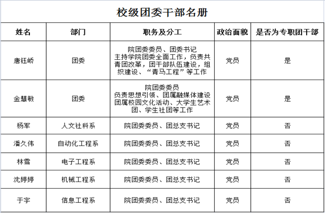 院团委共有专职工作人员2个,挂职工作人员0个,兼职工作人员5个。团委干部名册见下表: