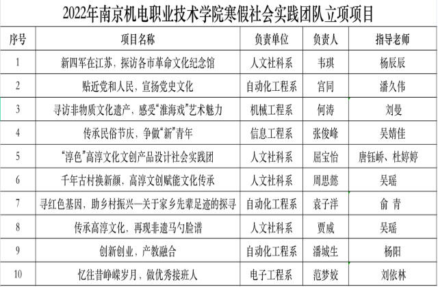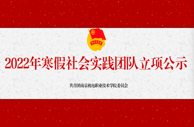 为深入学习贯彻习近平总书记在庆祝中国共产党成立100周年大会的重要讲话精神,进一步推动爱国主义教育与实践育人工作深度融合,引导机电学子以强国一代新青年的良好精神面貌迎接党的二十大胜利召开,庆祝中国共产主义青年团成立100周年。团委决定开展“小我融入大我,青春献给祖国”2022年星空体育·(中国)官方网站大学生寒假社会实践活动。经自主申报,各团总支、青马班审核推荐,校级专家评审,确定以下10个项目为2022年星空体育·(中国)官方网站寒假社会实践团队立项项目,并对立项的项目给予经费支持,现公示如下:
