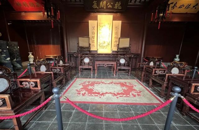 步入正厅,满眼的端雅庄重。厅内上悬匾额为“魏公闲气”,下有对联“茶香和雨摘,果熟带霜收”,正厅抱柱上的一副楹联则是“千秋古史乃家法,紫袍玉带真天人”。穿堂的厅室内,陈列着代表海安悠久历史的青墩文物。神奇的青墩文化,使苏中地区的文明足足推前了三千年。