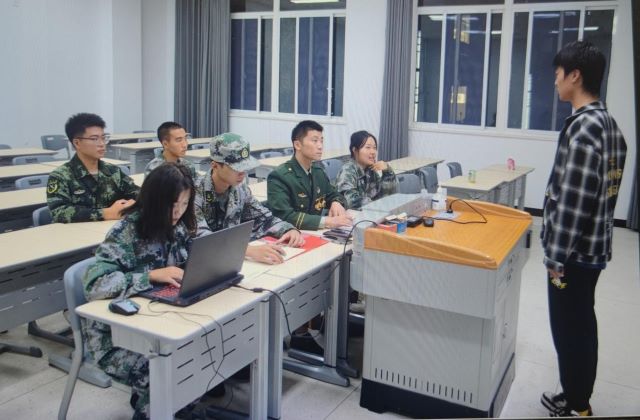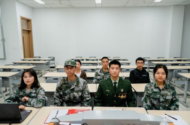 国旗班班长听取新生面试宣讲,同时并提出事宜的问题来考察新生处理相关问题和能力,他们从容而自信,对所题的问题认真作答,言谈举止中流露出加入国防教育协会的渴望,展现出浓厚的爱国主义情怀。