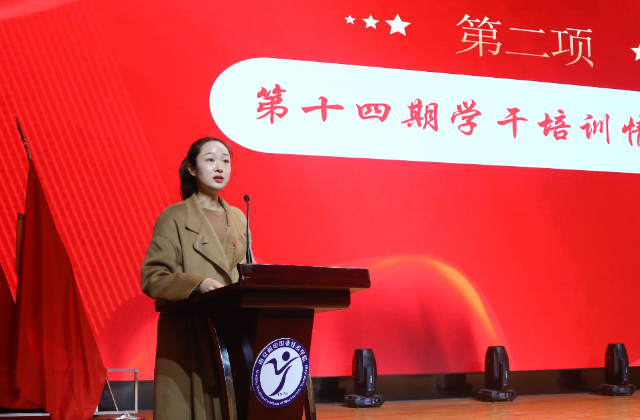 随着国歌声落下,学干培训结业仪式正式开始。团委书记唐钰峤作第十四期学干培训总结汇报,她表示,本次培训的是在调整学生组织架构后第二次大规模的培训,第一次用“学时考核”的方式进行。今年学干培训参培学员共492名,其中包含22位楼层长中两位学员担任其他学生干部纳入考核(楼层长本次不纳入考核),纳入考核的学员共472名,符合结业的339名,合格率71.82%;优秀学员95名,优秀率20%。希望通过此次的数据能让同学们引起重视,在领域范围内发挥好自己的作用。