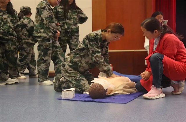 实操环节,老师们用人体模型给学生现场演示心肺复苏的完整操作流程,并让每位学生进行了现场实操练习,过程中强调了使用自动体外除颤器等注意事项,结合现实情境进行演示,用专业的技术和娴熟的手法演示了成功救助的全过程,迎来了现场阵阵掌声。理论加实践的有机结合,高效地让每一位学生学会了应急救护和意外伤包扎等基本操作。