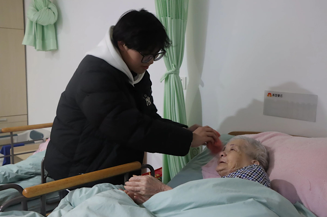 随后志愿者们根据分组安排,各自前往老人的居住区域,有的为老人捶背、剥橘子、聊家常,有的前去看望卧床不起的老人,有的辅助看护阿姨打扫卫生,志愿者们纷纷行动,为老人送去青春的温暖。