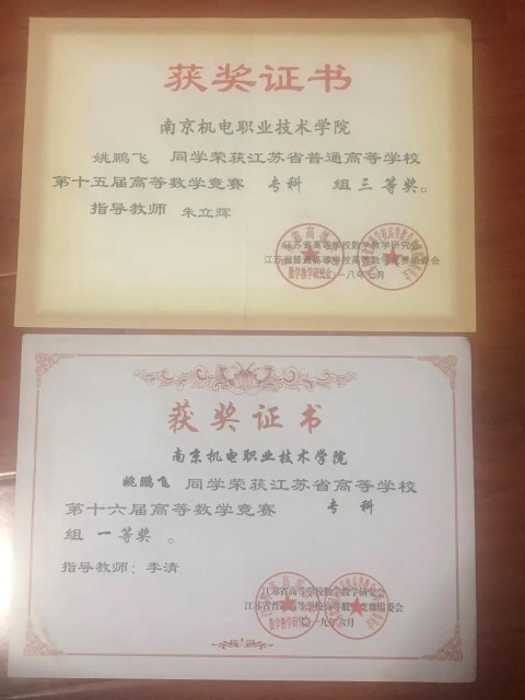 2016—2017学年:江苏省普通高校第十五届高等数学竞赛三等奖(省级);