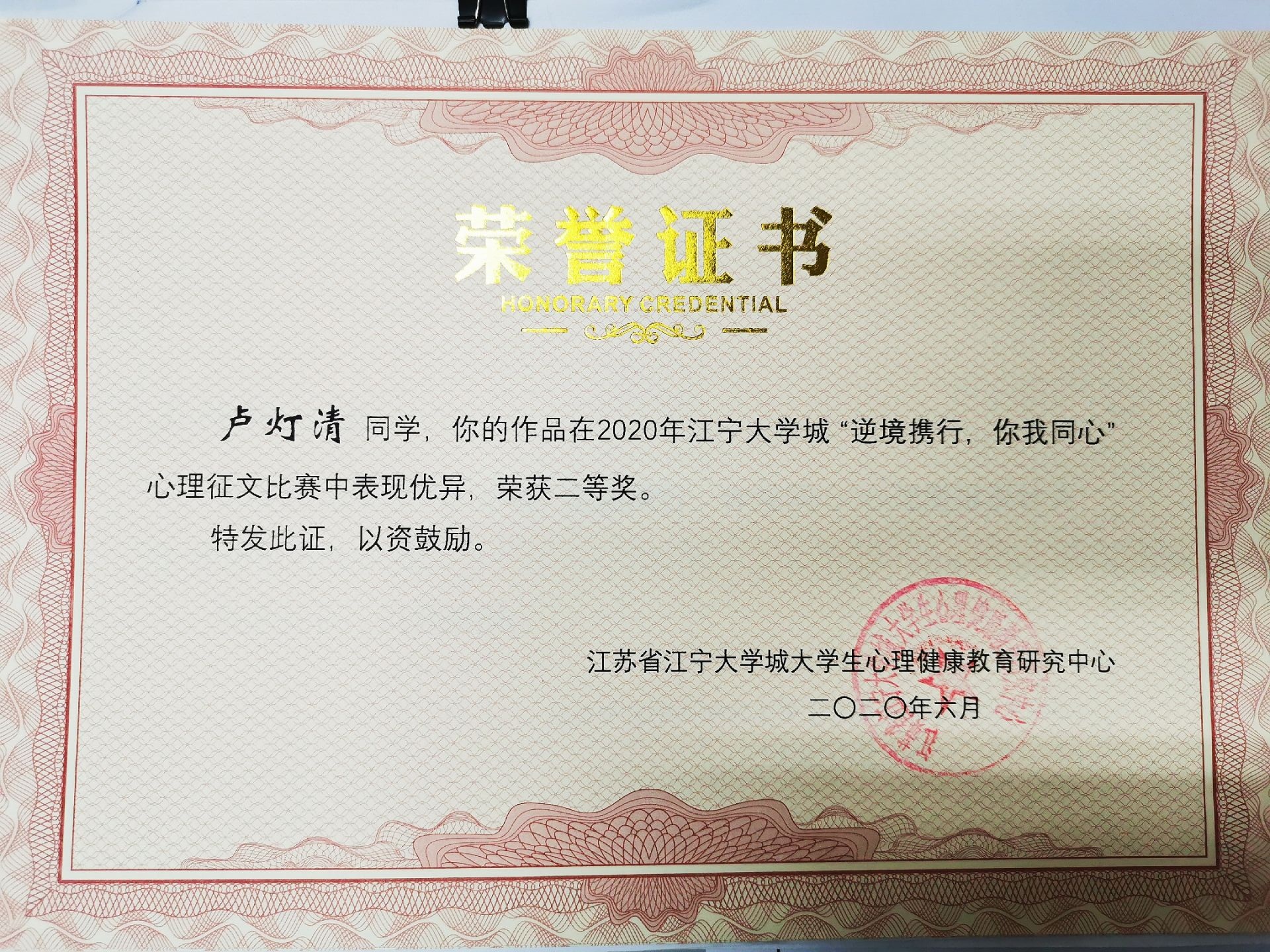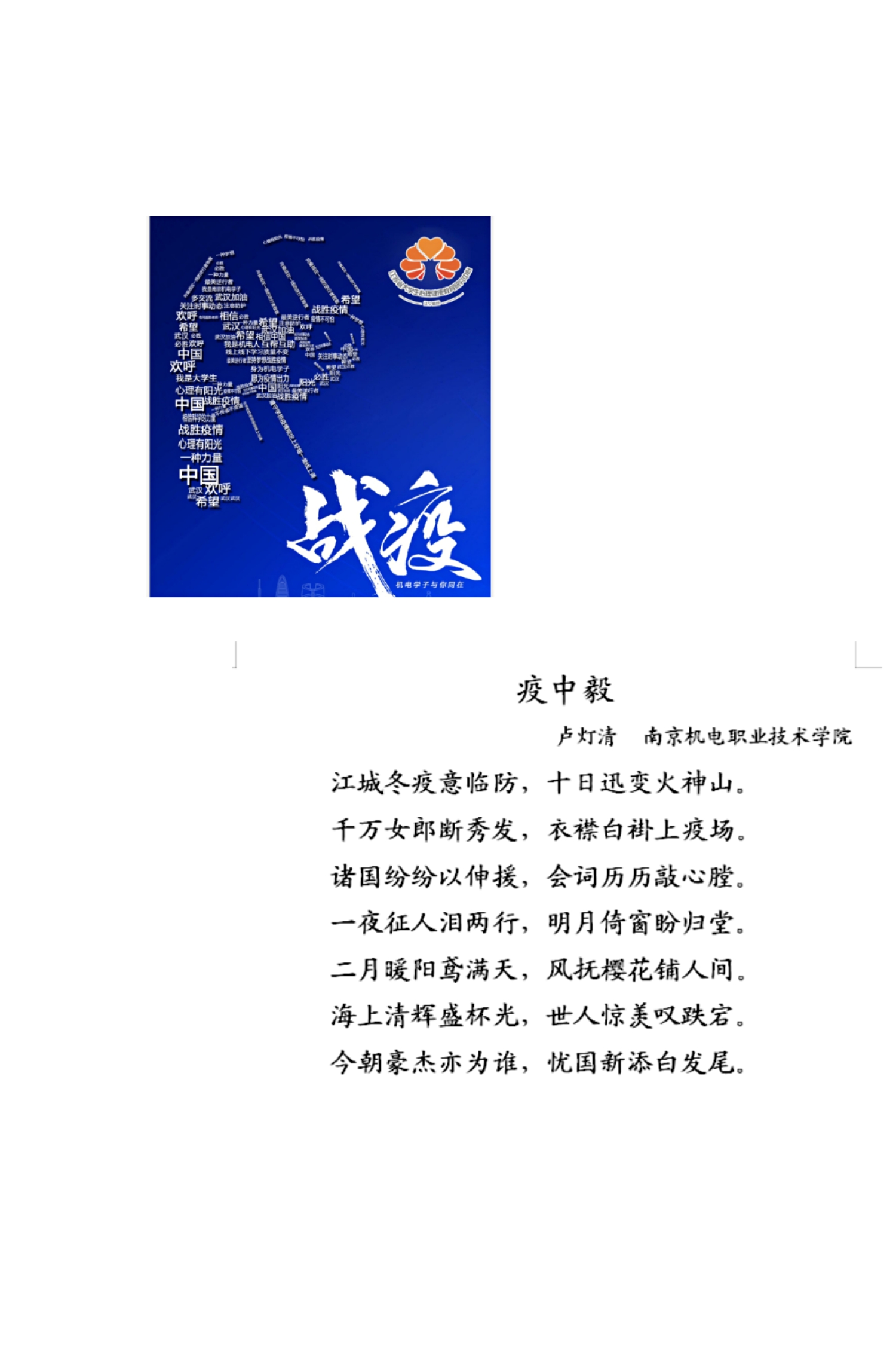 经过层层选拔,我系182软件技术卢灯清的心理征文作品-《疫中毅》,和182移动商务杨建的心理海报作品-《战役》分别获得二等奖和三等奖的好成绩。
