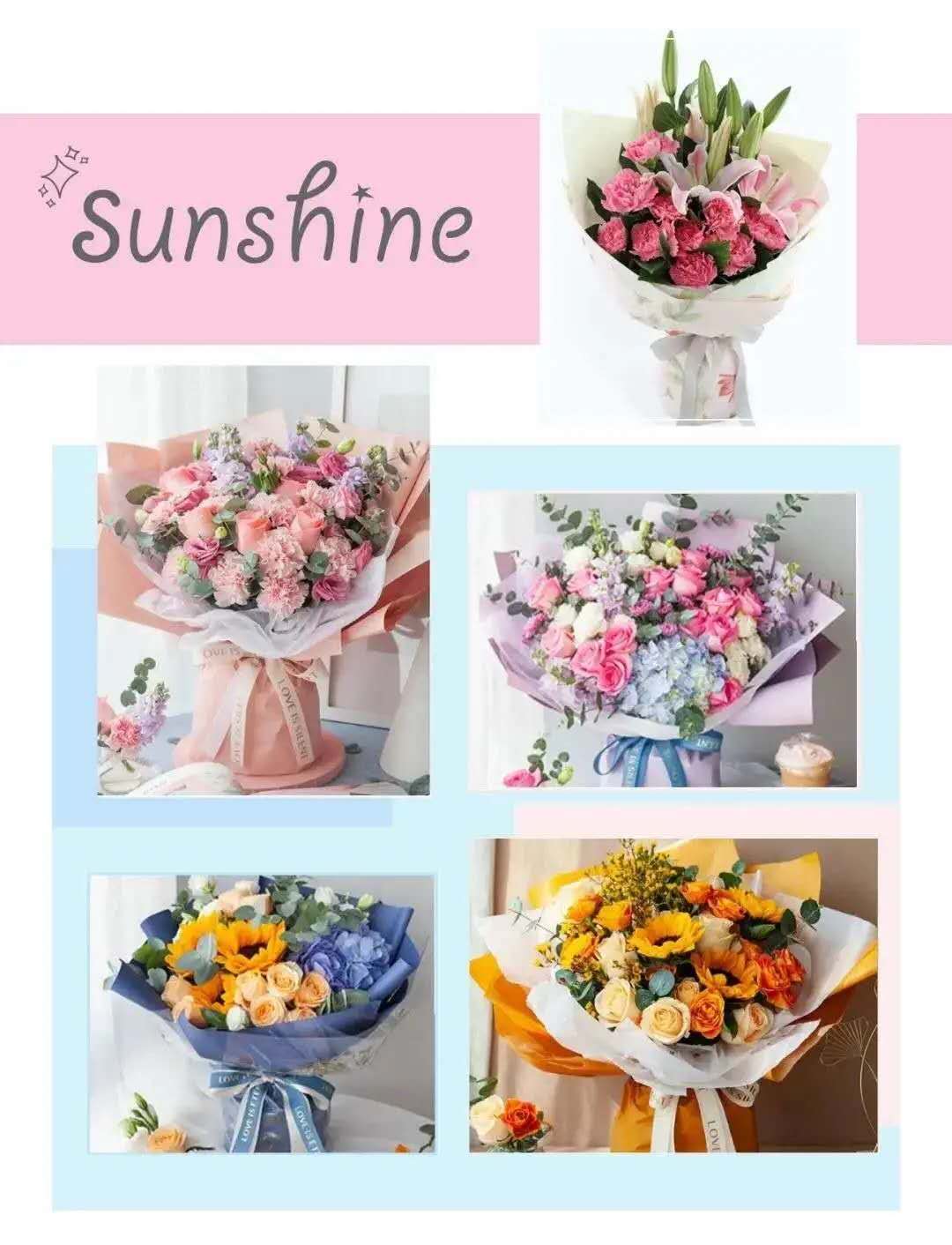 大叶尤加利和黄色腊梅衬着向日葵和香槟玫瑰的叫一路向阳;由白色百合点缀的粉色康乃馨花束叫恩情无限;戴安娜玫瑰、粉色洋桔梗、淡紫紫罗兰、尤加利和大把康乃馨扎成的暖色花束叫温柔以待;还有蓝绣球和白色洋桔梗的星河璀璨,红色康乃馨和栀子叶的幸福万年长,苏醒玫瑰和浅蓝绣球的青春有你……
