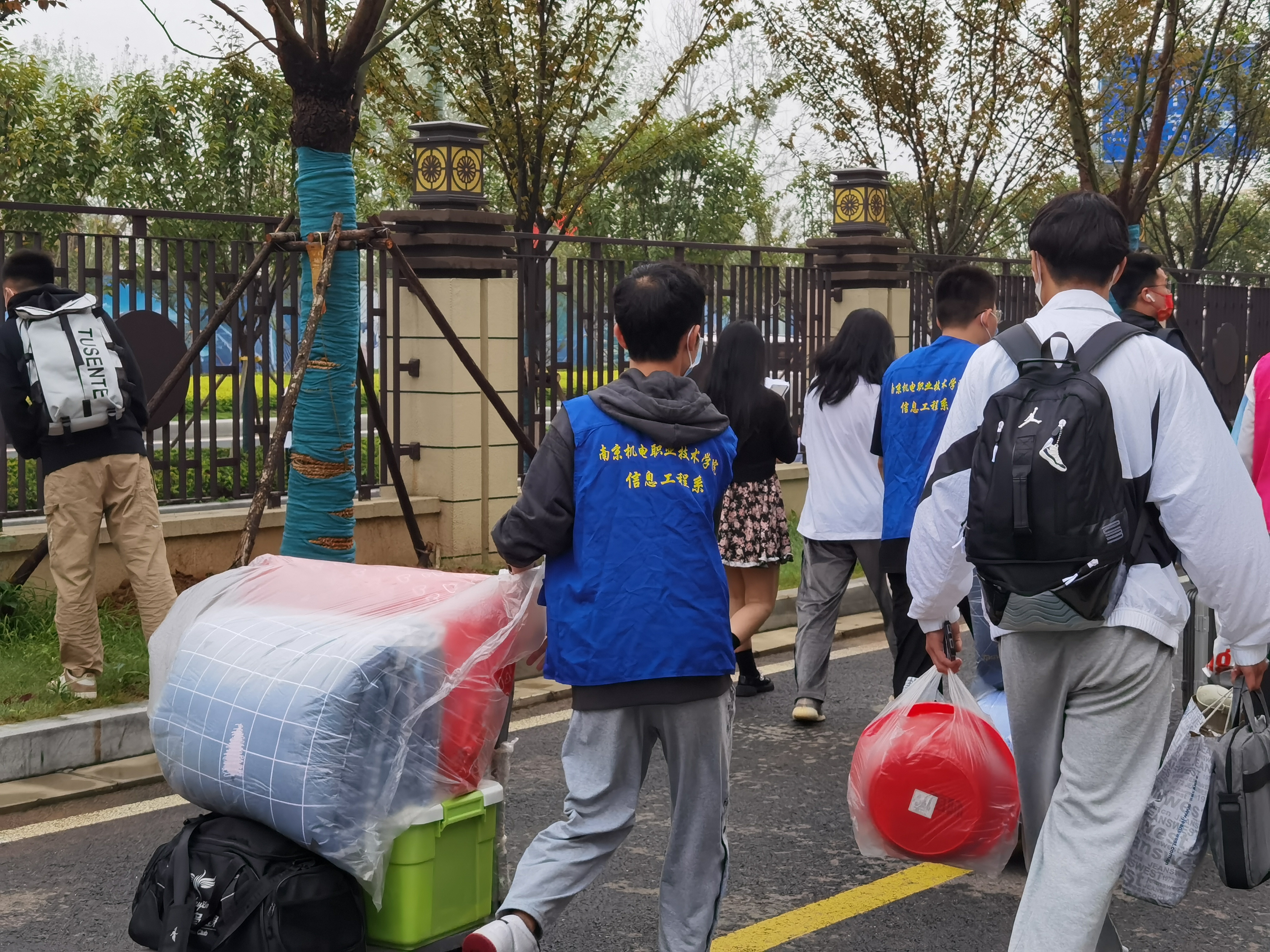 学校高度重视秋季学期学生返校报到工作,本着“严格管理,科学防控”的原则,精心做好疫情防控常态化形势下各项迎新准备工作。14日上午8时,志愿者们分别赴南京南站、南京站和校门口迎接新同学。每一个新生和家长的到来,志愿者都会热情迎上,帮助新生把行李从车上搬下来。本着培养学生独立自主精神,志愿者们会提供小推车让新生能够依靠自己将行李搬到宿舍。为方便新生报到,志愿者与宿管阿姨对新生做好引导工作,为新生提供便利,全力做好后勤保障工作。晚上,信息工程系值班领导和老师深入学生宿舍看望报到新生,了解学生家庭基本情况,同时向他们介绍学院资助奖助贷相关政策,让学生感受到了老师对他们的关心和爱护。