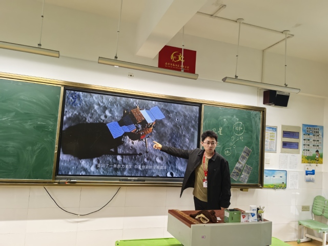在这次活动中,黄威以生动活泼、饶有趣味的讲解方式,向同学们提出了引人深思的问题:“大家知道月球与地球之间存在着怎样密切的联系吗?”“在大家的心目中,人造卫星又该是怎样一番模样呢?”随后,他不仅深入浅出地介绍了人造卫星技术及其背后的科学家精神等丰富知识,还精心挑选了视频资料,生动展现了由南机电师生团队自主研发的“南京号”八一08星。通过这些直观而震撼的影像,孩子们得以深切感受到浩瀚宇宙的无限深邃与神秘,同时也被南机电师生勇于探索未知、以智慧叩问苍穹的壮志豪情所深深打动。
