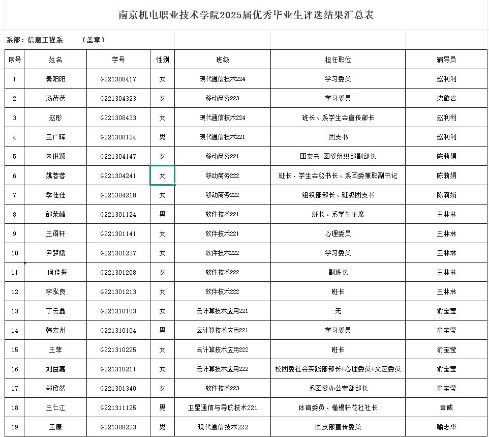 根据《关于评选2025届优秀毕业生的通知》(南机电院学﹝2025﹞4号)文件精神,经班级评选,系部审核,决定拟推荐以下17名同学为2025届星空体育·(中国)官方网站优秀毕业生。现予以公示,公示时间:2025年4月24日——2025年4月26日。联系人:郝麒,电话:18061237654。