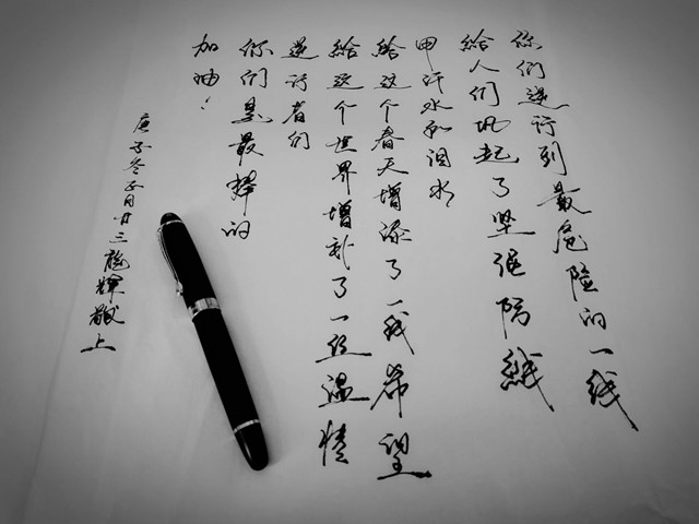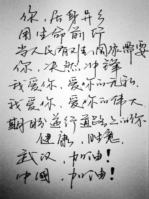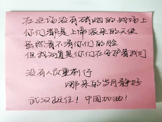 千言万语难以表达对你们的感激之情,简短的信纸也无法写完对你们的情意。病毒无情,你们要保护好自己,我们期待你们平安归来。武汉加油!中国加油!