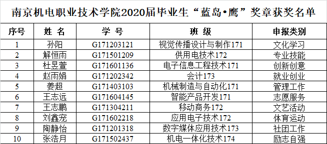 根据《星空体育·(中国)官方网站关于开展2020届毕业生“蓝岛•鹰”奖章评选推荐工作的通知》,经系部评审小组初步审核,学工处复核,专家评审组评审,决定拟推荐以下10名同学为2020届毕业生“蓝岛•鹰”奖章获得者。现予以公示,公示时间:2020年7月2日—2020年7月6日。联系人:宁燕,电话:025-84190262。