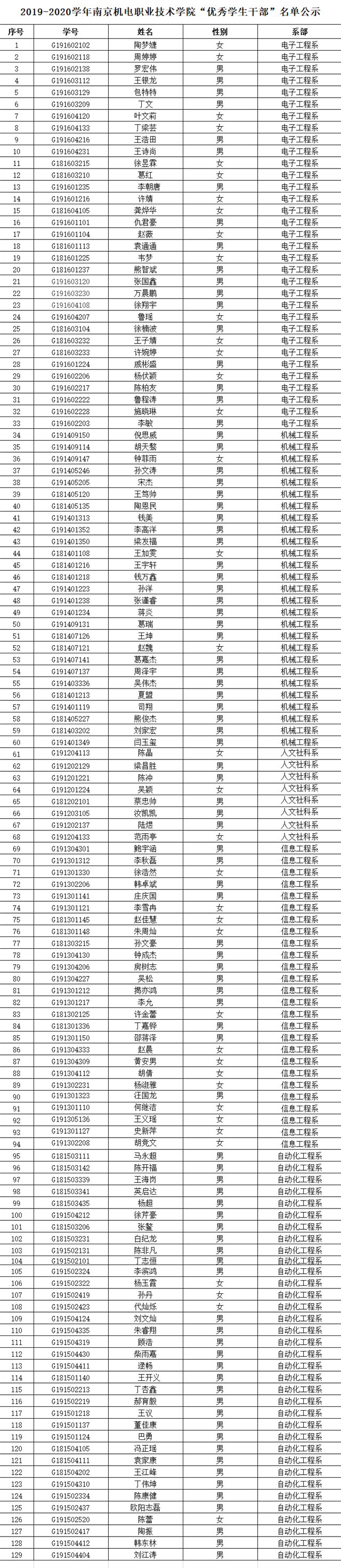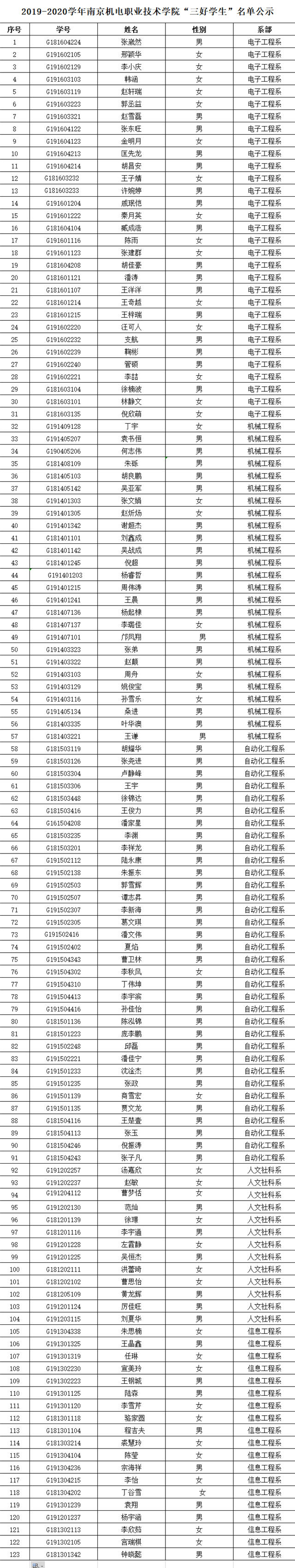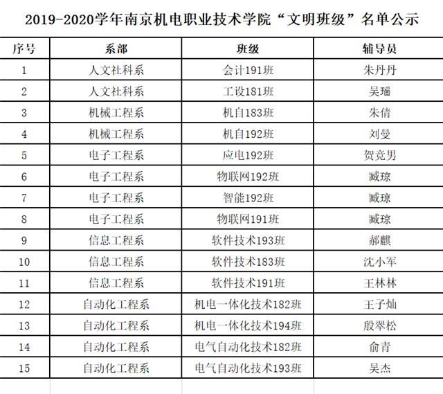 根据《星空体育·(中国)官方网站2019-2020学年三好学生、优秀学生干部、文明班级评选通知》规定,经学生本人申请、班级评议,系部审核推荐,学工处核准,学校审批,在公平、公正、公开的基础上,拟评选出以下个人和班级为2019-2020学年星空体育·(中国)官方网站“三好学生”、“优秀学生干部”、“文明班级”,现将名单公示如下。