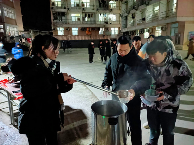 你看,萧瑟的寒风中,同学们排着长队,手持饭盒,每个人的脸上都洋溢着欢快的笑容。学工处处长张宝中、各系部领导、学工处老师也来到现场,手持长勺为学生们添上一勺勺热乎乎的八宝粥。一句句暖心的话语,一声声亲切的问候,使得一碗简单的八宝粥变得不再普通,其中包含了学院对同学们的重视、老师对同学们的关心以及同学和同学之间的友爱……