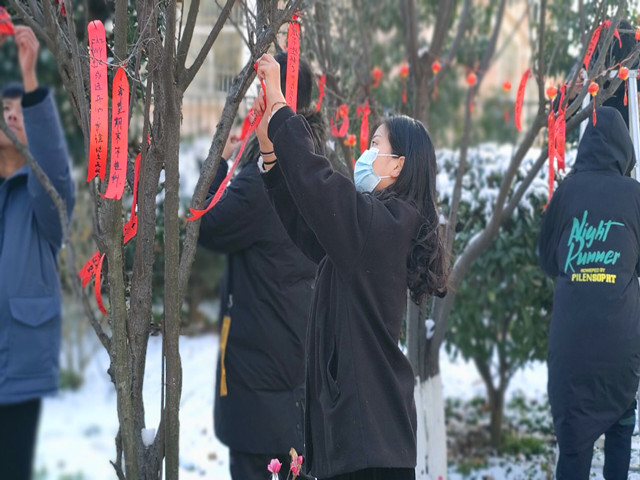 时值隆冬,虽然寒风凛冽,学院学工处老师、各系部领导、辅导员老师、同学们均积极参与其中,写下对学院2021美好的祝愿。拿起笔、弯下腰,用最认真的态度书写美好的愿望,用最动人的话语表达满心的期许。你看,在彩灯地闪烁下,这写满星语心愿的红丝带正在“许愿树”上随风飘荡,这美丽的景色不禁为老校区的冬天留下最浓墨的一笔。