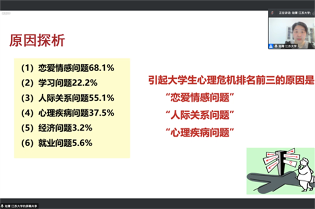 为提升广大心理委员的工作水平,发扬朋辈助人的优良品质,带领和引导全校学生心向阳光,砥砺前行,2022年4月12日下午,大学生健康成长中心举行了“向阳携行 共创未来——大学生心理危机预防与转介”线上主题培训。本次培训特邀江苏大学心理中心副主任陆菁老师主讲,由大学生健康成长中心龚智俐老师主持。