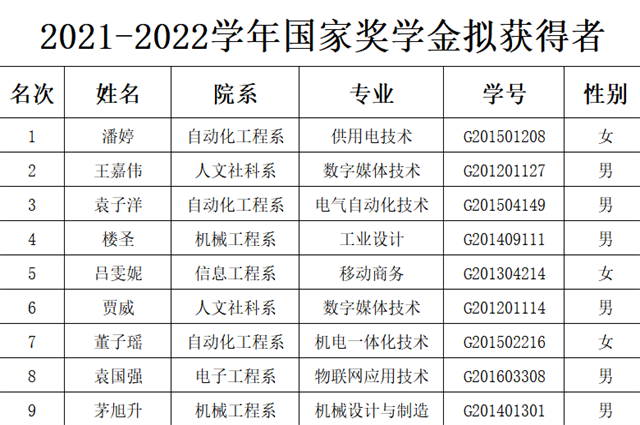 根据《省教育厅关于做好2022年普通高校国家奖学金有关工作的通知》苏教助函〔2022〕9 号、《教育部 财政部关于印发<本专科生国家奖学金评审办法>的通知》教财函〔2019〕105号、《江苏省学生资助资金管理办法》、《江苏省学生资助管理实施细则》文件精神。我校认真落实国家奖学金评审相关细则,各系部通过召开系部国家奖学金评审小组会议,认真贯彻落实国家奖学金评定要求,本着公开、公正、公平的原则,经学生个人申报,班级评议通过,上报系部评议小组,系部对申请学生各项指标、材料进行初审并提出意见,经系部同意,公示完毕,正式上报学校大学生资助管理中心。经学校大学生资助管理中心复审,逐一核实各系部提交国家奖学金候选人材料,核实无误后,上报学校国家奖学金评审领导小组,经学校国家奖学金评审领导小组同意,于2022年10月13日组织召开学校国家奖学金评审会。拟确定九位同学为星空体育·(中国)官方网站2021-2022学年国家奖学金获得者。