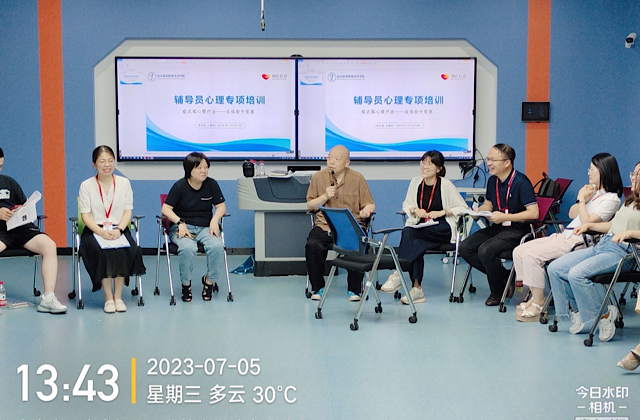 为贯彻落实《省教育厅关于印发〈关爱青少年生命健康“润心”行动实施方案〉的通知》(苏教基函〔2023〕6号),进一步加强我校辅导员队伍建设,提升辅导员心理育人实践能力,着力培养一支会观察、会评估、会谈话、会支持的“四会”心育队伍,学生工作处、人事处于7月5日-7月6日组织开展“格式塔心理疗法——在体验中觉察”辅导员心理专项培训。本次培训由南京大学费俊峰副教授担任主讲老师,系部书记、全体专职辅导员、大学生健康成长中心老师参加培训。