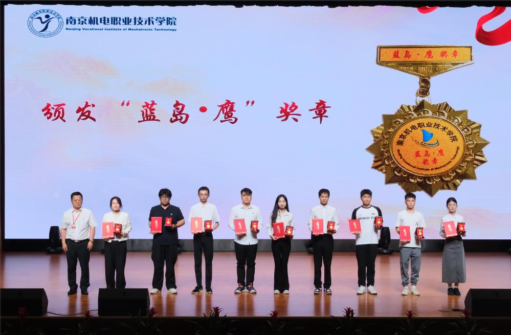 笔端生芳华,润物谢师恩。毕业生代表为教师、辅导员、宿管阿姨、食堂师傅等教职工代表献花。伴随“蓝岛•鹰”奖章颁奖词走进第四篇章“梦想起航”,党委书记、校长周庆礼为获得“蓝岛•鹰”奖章的应届毕业生颁奖。