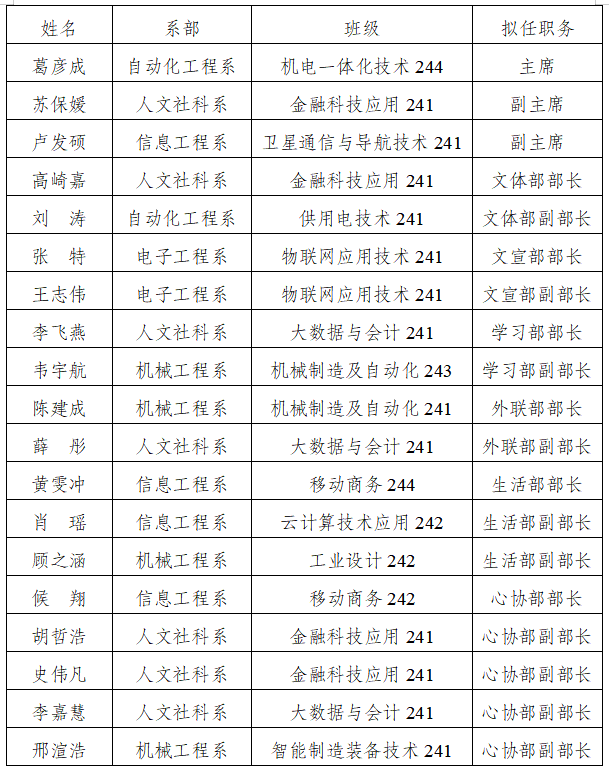 根据《星空体育·(中国)官方网站学生会章程》相关规定,为切实加强学生干部队伍建设,校学生会于2025年6月开展了第二十届学生干部换届竞选工作,经学生自主报名、组织推荐、资格审查、竞选答辩、综合考察等环节,选拔产生了拟任人选,为提高学生干部选拔的透明度,现将拟任人选的名单予以公示。