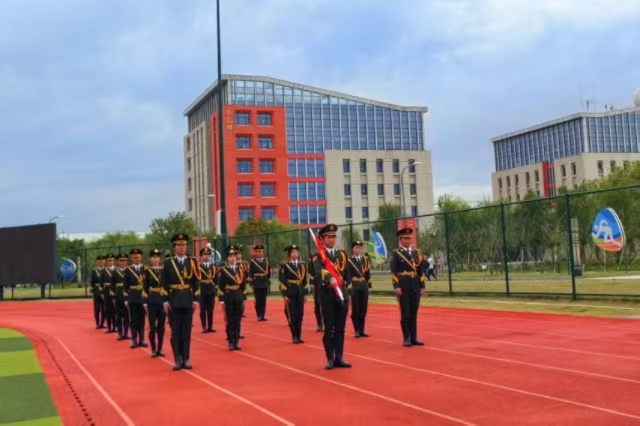 庄严肃穆启新篇,仪式感中显担当。仪式在协会成员整齐划一的入场中开启,随着《中华人民共和国国歌》的激昂旋律响起,全体人员肃立致敬,鲜艳的五星红旗冉冉升起。随后,全体队员进行队列展示—— 标准的军姿、整齐的步伐、刚劲的转体,每一个动作都彰显着国防教育协会平日里严格训练的成果,展现出“纪律严明、作风优良”的精神风貌。