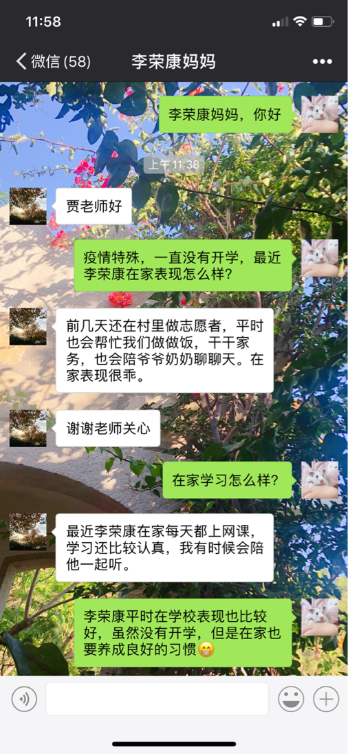 为了真实了解学生在家的状态,辅导员贾涵在假期也与家长保持交流与沟通。在与机电一体化技术192班李荣康同学母亲沟通中,李荣康的妈妈说,虽然这个寒假过的很长,但是李荣康在家里依旧能够给自己的生活做好计划,不仅能够安排好自己的学习,及时完成工作以外,在疫情需要的时候,不怕艰辛,为村里的疫情检查站做志愿者服务;平时在家里,主动帮忙家长做饭、承担家务;一个学期不在家,在这个假期中,陪已经年迈的爷爷奶奶聊天。
